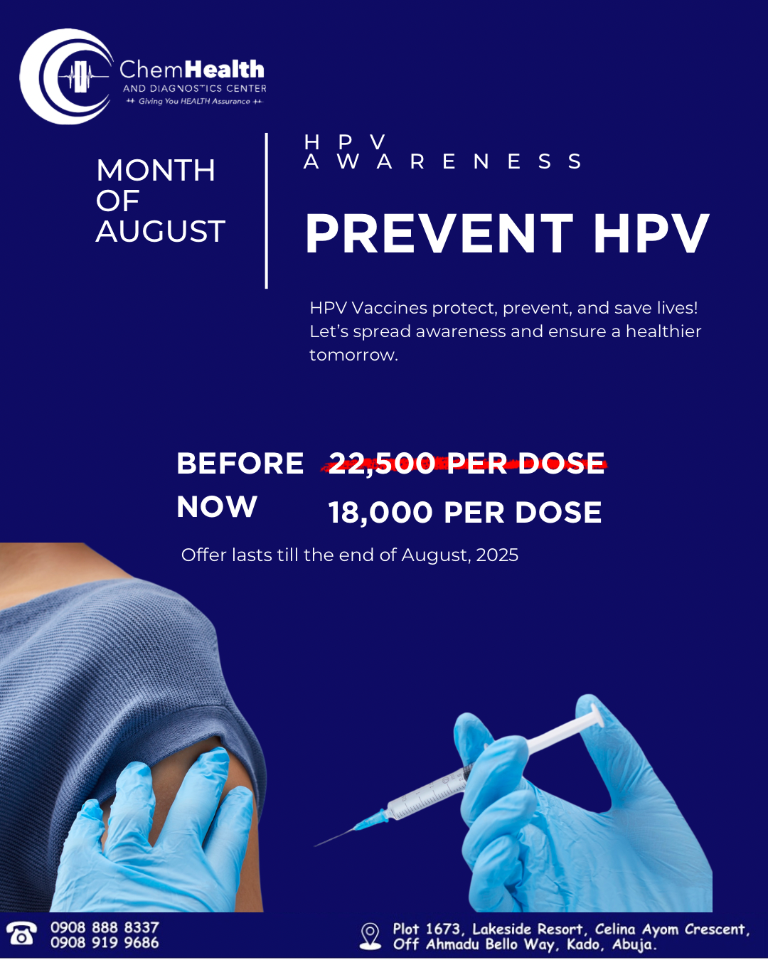 Visit Chem Health & Diagnostics Center today or call 090-88888337 to book your HPV screening and vaccination.